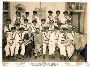 Banda de Música Santa Cecília – À esquerda, a banda está no interior do casarão e à direita, a banda desfila pela lateral do Casarão, 1948.